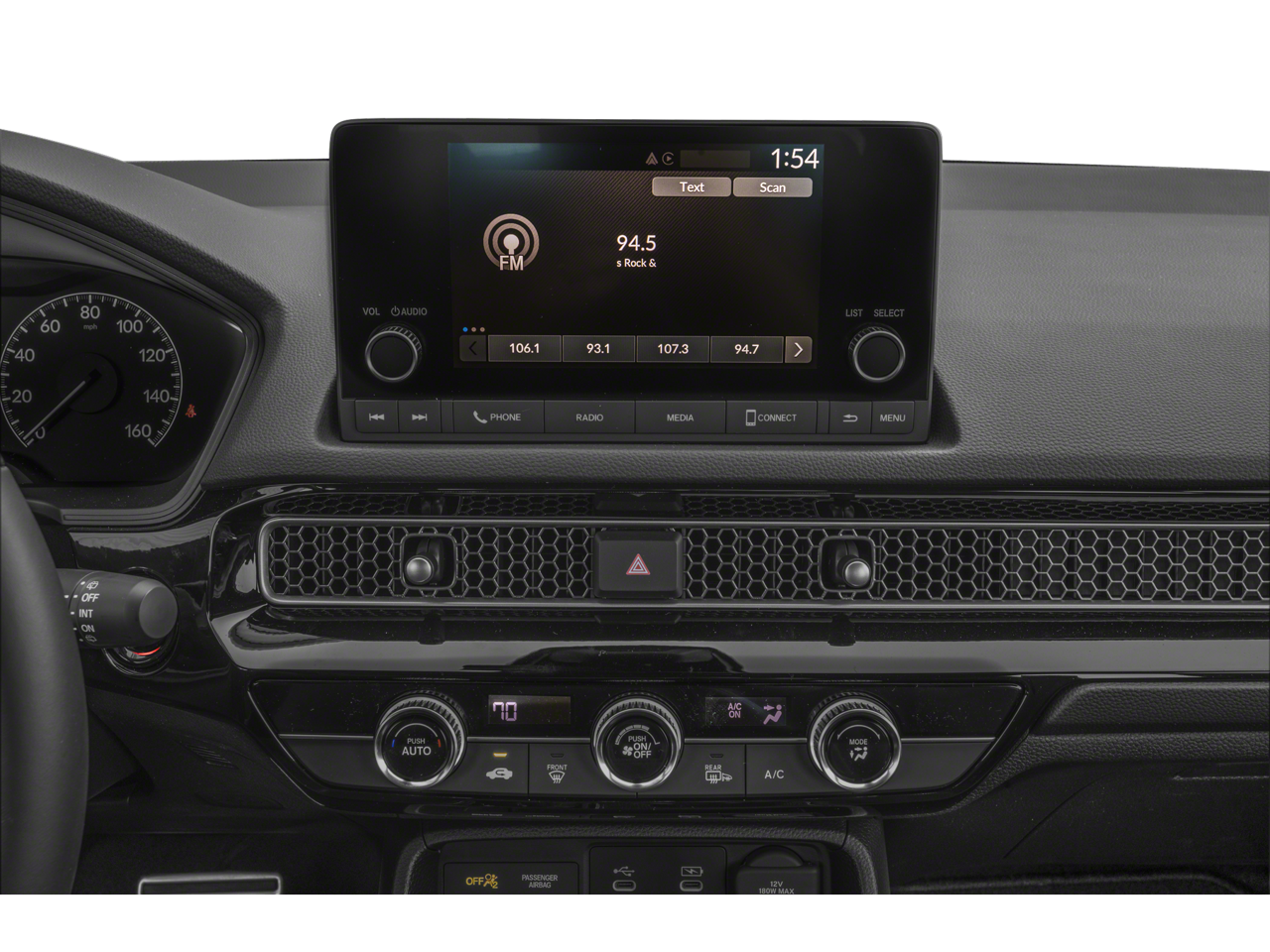 - Radio: Sistema de audio de 180 vatios -inc: 8 altavoces, pantalla táctil en color de 7", Bluetooth® HandsFreeLink y streaming de audio, HondaLink, compensación de volumen sensible a la velocidad (SVC), sistema de datos de radio (RDS), compatibilidades Apple CarPlay y Android Auto e interfaz de smartphone/audio USB-C 3.0A en asientos delanteros.