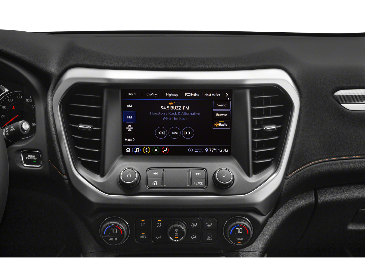 - Sistema de audio, Sistema de infoentretenimiento GMC con navegación de 8" en diagonal incluye pantalla multitáctil, estéreo AM/FM/SiriusXM, streaming de audio Bluetooth® para música y la mayoría de teléfonos, capacidad Android Auto y Apple CarPlay para teléfonos compatibles, reconocimiento avanzado de voz, aplicaciones en el vehículo, perfiles personalizados para infoentretenimiento y ajustes del vehículo.