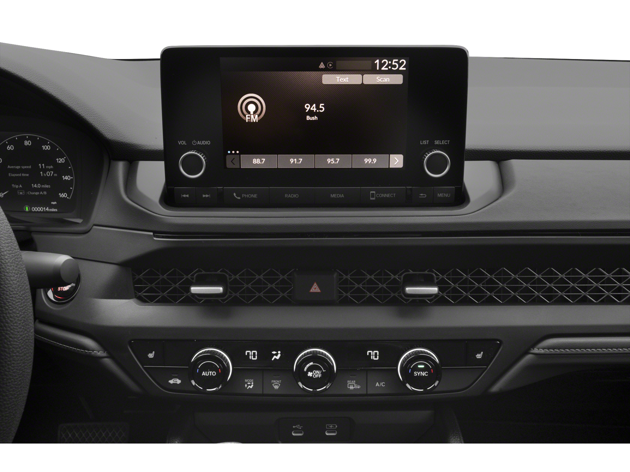 - Radio: Sistema de audio AM/FM de 180 vatios -inc: 8 altavoces, pantalla táctil en color de 7", compatibilidad con Apple CarPlay y Android Auto por cable, streaming de audio Bluetooth®, 1 interfaz de audio/smartphone USB-C 3.0A, 1 puerto de carga USB-C 3.0A, capacidad de hotspot wi-fi y servicios de suscripción HondaLink.