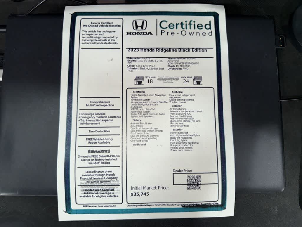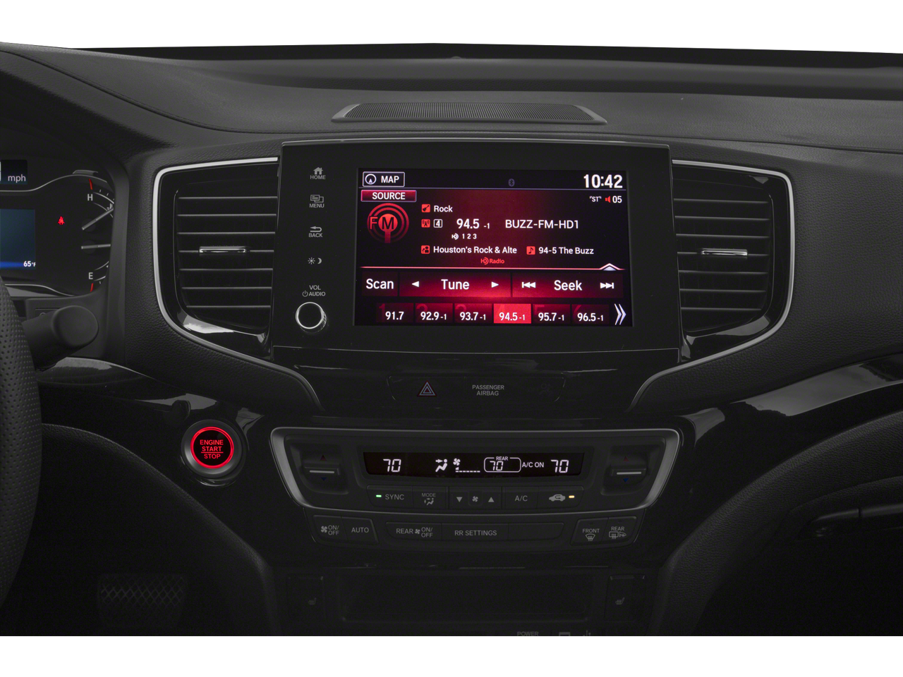 - Radio: sistema de audio premium de 540 vatios con 8 altavoces (incluye subwoofer), transmisión de audio por Bluetooth®, entrada auxiliar y para MP3, sistema de datos de radio (RDS), compensación de volumen sensible a la velocidad (SVC), pantalla de audio de 8 pulgadas con pantalla táctil electrostática de alta resolución y ajustes personalizables, compatibilidad con Apple CarPlay, compatibilidad con Android Auto, HondaLink, función de mensajes de texto SMS (compatible con determinados teléfonos con Bluetooth®; se aplican las tarifas de su operador de telefonía móvil; las leyes estatales o locales pueden limitar el uso de la función de mensajes de texto; utilice la función de mensajes de texto solo cuando las condiciones le permitan hacerlo de forma segura), interfaz USB de 1,5 amperios para smartphone/audio en la consola delantera (1 puerto), radio HD, sistema de audio para la caja de la camioneta y cargador inalámbrico para el teléfono